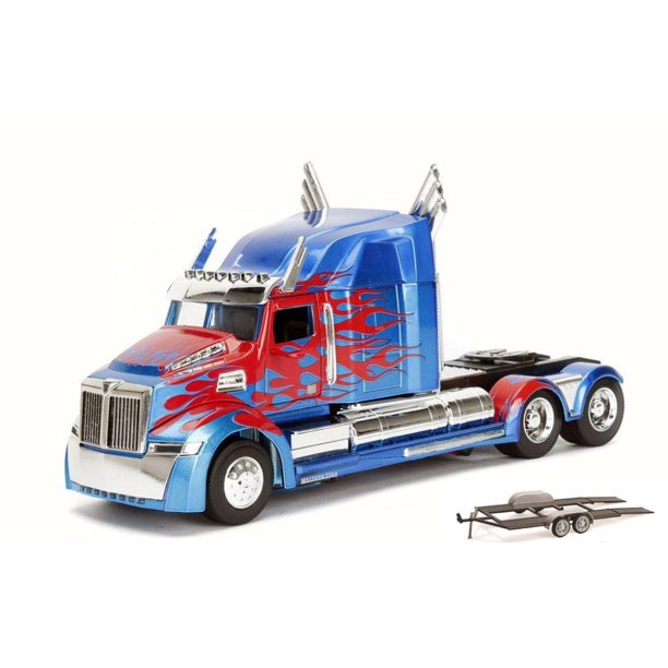 Diecast Car Trailer Package Transformers 5 Optimus Prime Blue W Red Jada 98403 12 1 24 Scale Diecast Model Toy Car W Trailer Walmart Com
